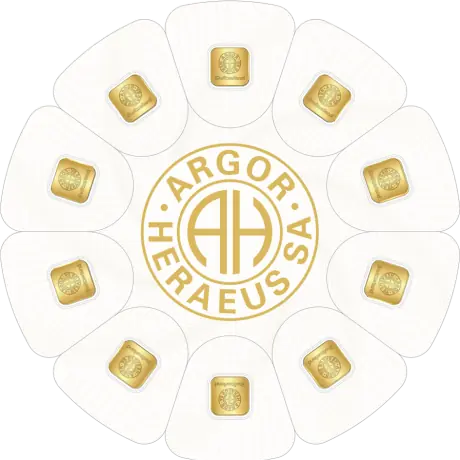 Zde máte deset ražených slitků , každý o hmotnosti 1 gramu , které lze jednotlivě vyjmout. Každý slitek je pyšný nápisem „Au 1 g Fine Gold 999.9“, což značí zlato o ryzosti 999,9 . Na zadní straně najdete logo společnosti obklopené nápisem „ARGOR-HERAEUS“.